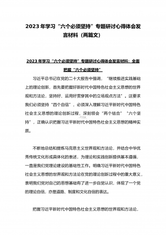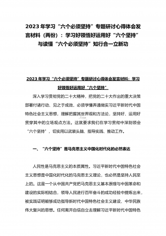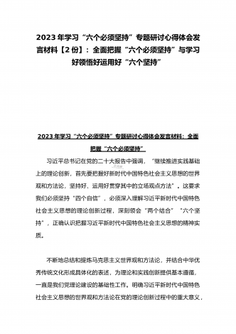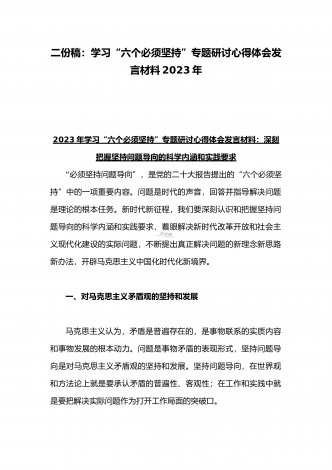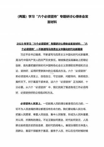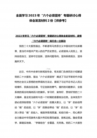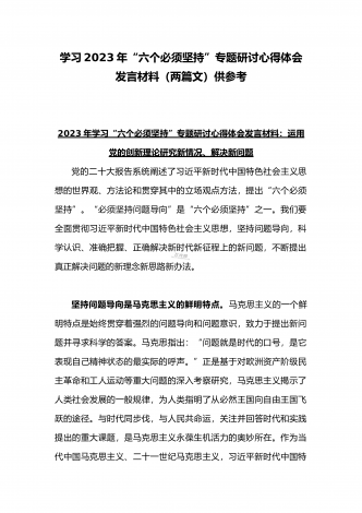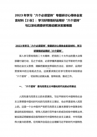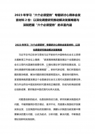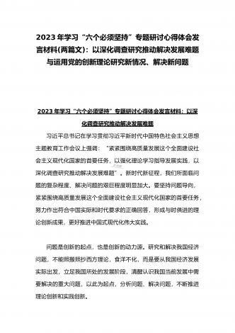 2023年学习“六个必须坚持”专题研讨心得体会发言材料(两篇文):以深化调查研究推动解决发展难题与运用党的创新理论研究新情况、解决新问题