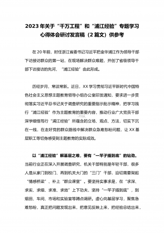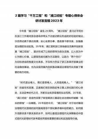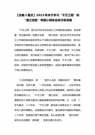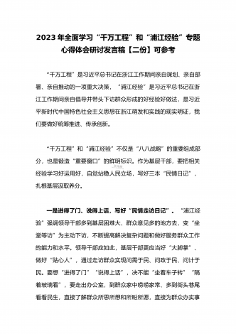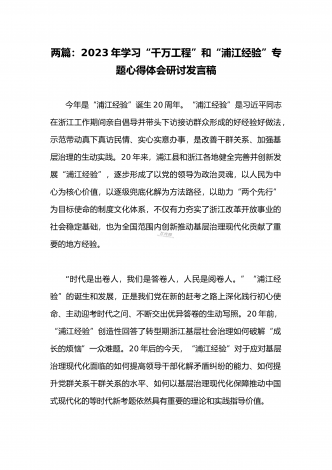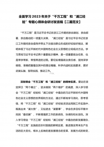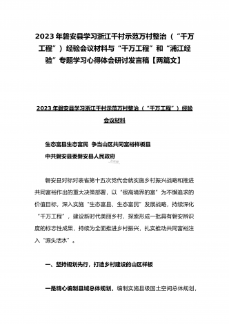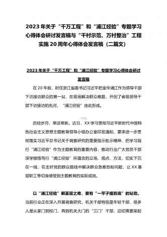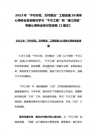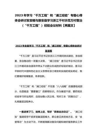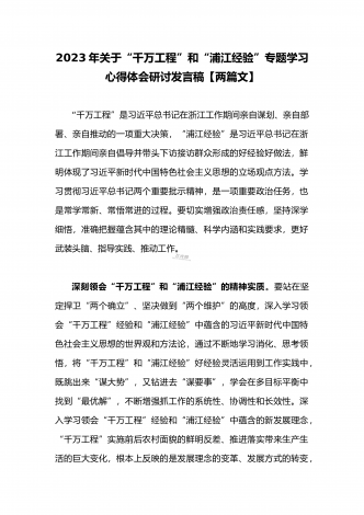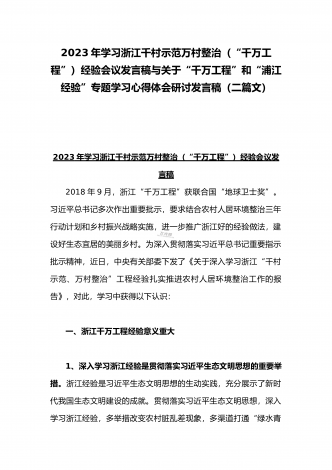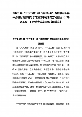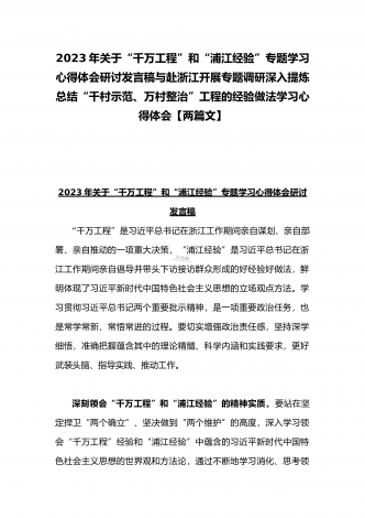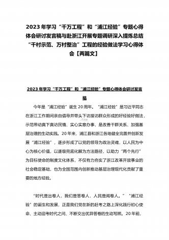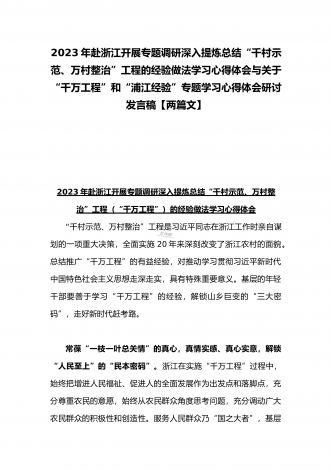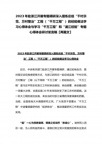 2023年赴浙江开展专题调研深入提炼总结“千村示范、万村整治”工程(“千万工程”)的经验做法学习心得体会与学习“千万工程”和“浦江经验”专题心得体会研讨发言稿【两篇文】