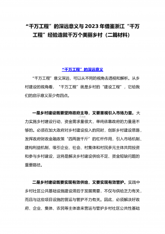 2023年赴浙江开展专题调研深入提炼总结“千村示范、万村整治”工程(“千万工程”)的经验做法学习心得体会与学习“千万工程”和“浦江经验”专题心得体会研讨发言稿【两篇文】2023年赴浙江开展专题调研深入提炼总结“千村示范、万村整治”工程(“千万工程”)的经验做法学习心得体会近日,中央有关部门赴浙江开展专题调研,通过实地走访、面对面交谈切身感受等方式,与浙江的同志一起总结实施“千村示范、万村整治”工程(以下简称“千万工程”)的经验启示。“千万工程”是习近平同志在浙江工作时亲自谋划、亲自部署、亲自推动...