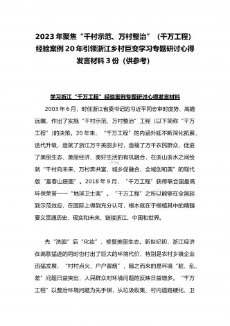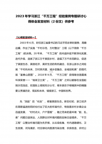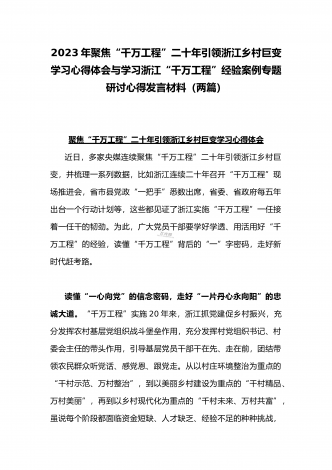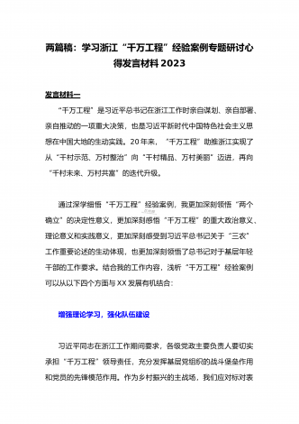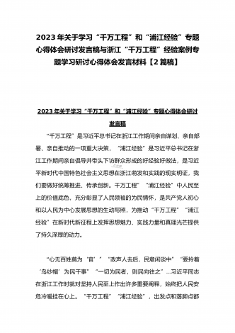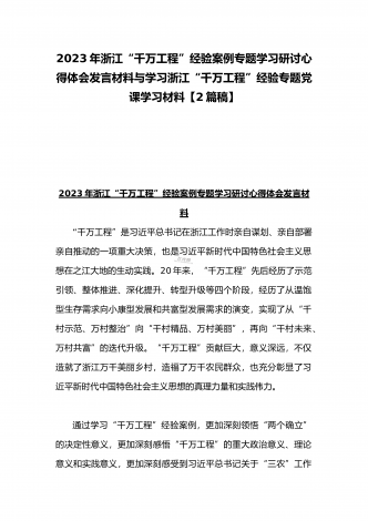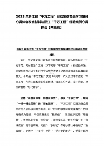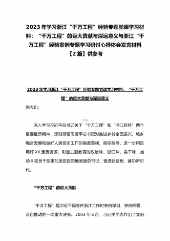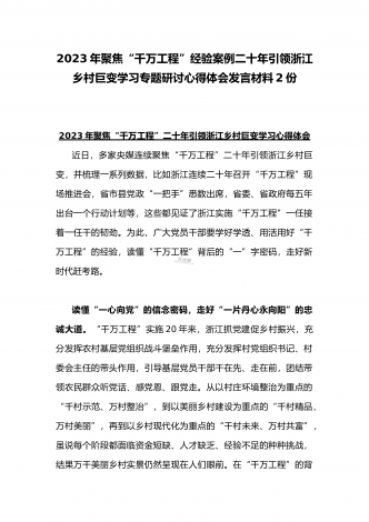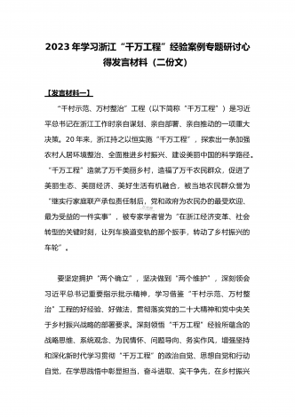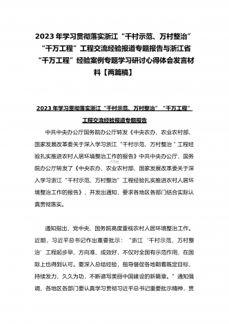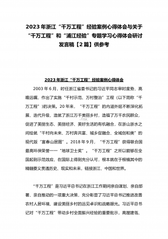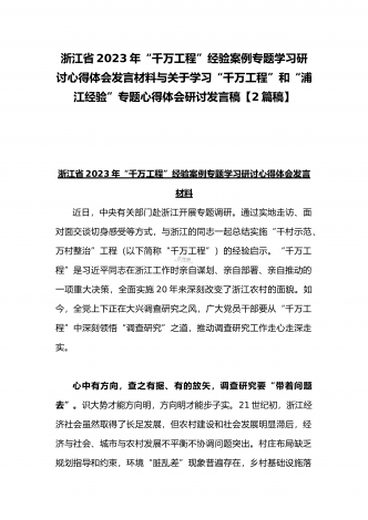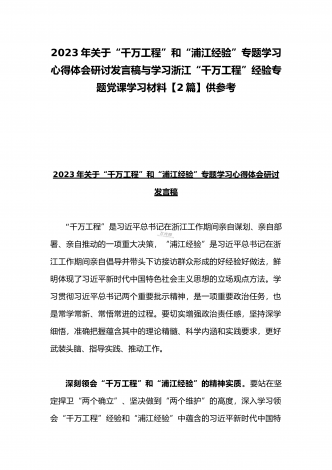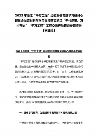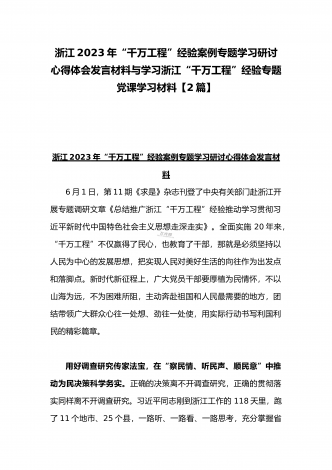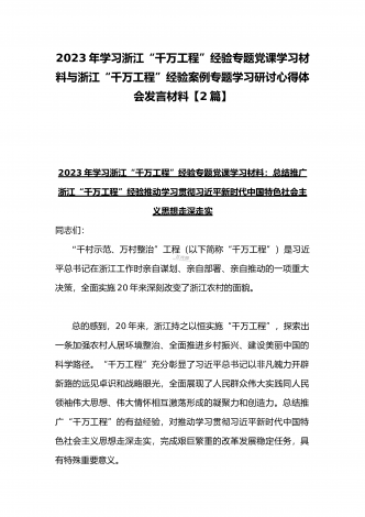 2023年学习浙江“千万工程”经验专题党课学习材料:“千万工程”蕴含乡村振兴的规律性认识与浙江“千万工程”经验案例专题学习研讨心得体会发言材料【两篇稿】