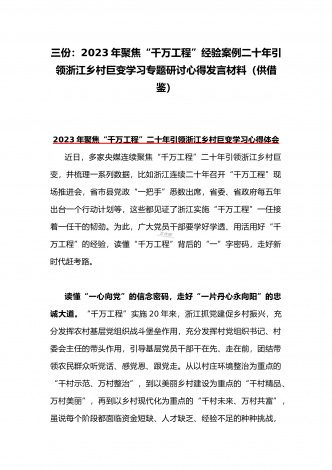 2023年学习浙江“千万工程”经验专题党课学习材料:“千万工程”蕴含乡村振兴的规律性认识与浙江“千万工程”经验案例专题学习研讨心得体会发言材料【两篇稿】2023年学习浙江“千万工程”经验专题党课学习材料:“千万工程”蕴含乡村振兴的规律性认识同志们:“千万工程”实施20年来,深刻改变了浙江乡村面貌,为浙江高质量发展建设共同富裕示范区打下坚实基础,探索出一条加强农村人居环境整治、全面推进乡村振兴、建设美丽中国的科学路径。“千万工程”蕴含着习近平新时代中国特色社会主义思想的世界观和方法论,深入学习“千...