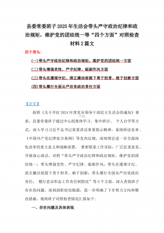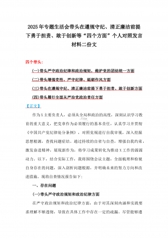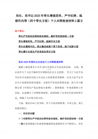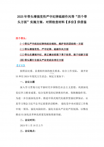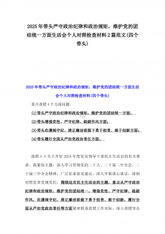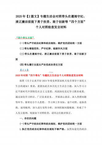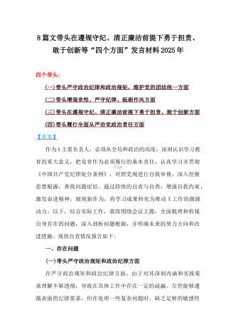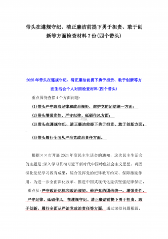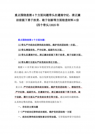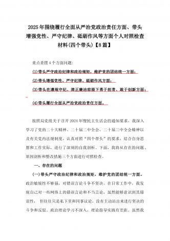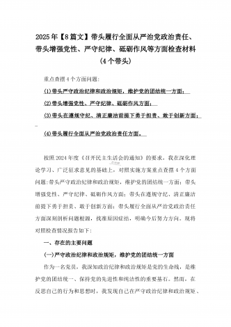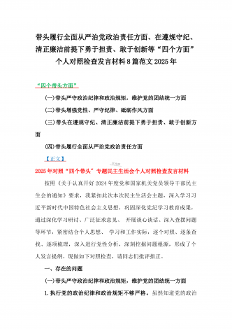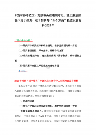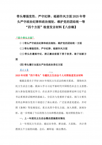 【汇编8篇文】2025年带头增强党性、严守纪律、砥砺作风、严守政治纪律和政治规矩,维护党的团结统一方面等“四个方面”个检查发言材料(重点围绕查摆4个方面问题)2025年带头增强党性、严守纪律、砥砺作风等方面生活会个人对照检查材料(四个带头)重点查摆4个方面问题:(1)带头严守政治纪律和政治规矩,维护党的团结统一方面;(2)带头增强党性、严守纪律、砥砺作风方面;(3)带头在遵规守纪、清正廉洁前提下勇于担责、敢于创新方面;(4)带头履行全面从严治党政治责任方面。按照《关于开好2024年度民主生活会的...
