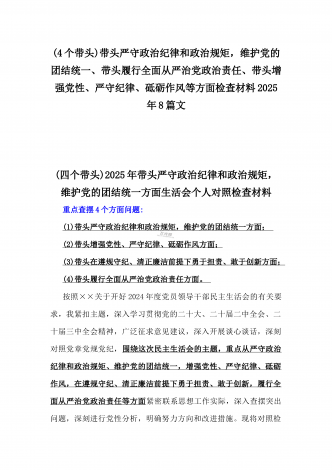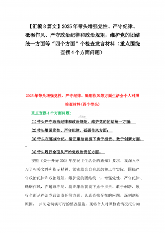 【汇编8篇文】2025年带头增强党性、严守纪律、砥砺作风、严守政治纪律和政治规矩,维护党的团结统一方面等“四个方面”个检查发言材料(重点围绕查摆4个方面问题)