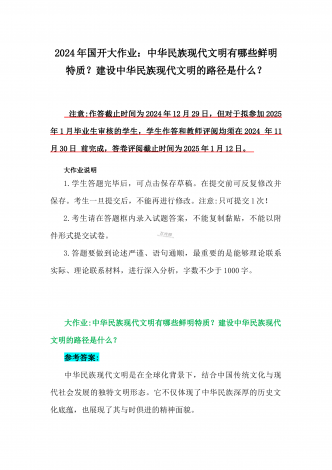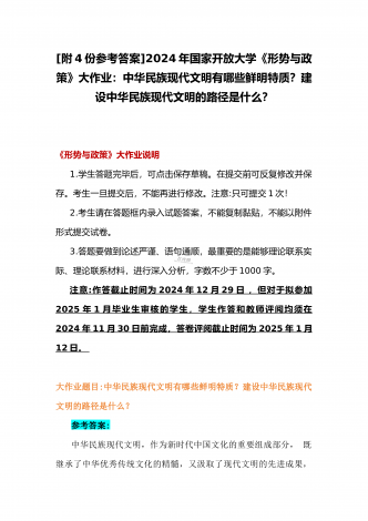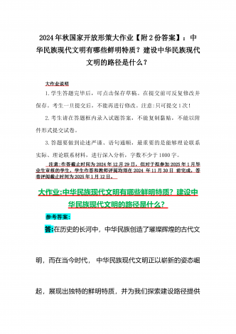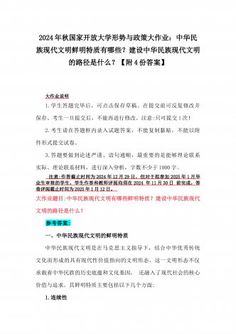 2024年秋国家开放大学《形势与政策》大作业:理论联系实际,结合材料进行深入分析中华民族现代文明的鲜明特质有哪些?建设中华民族现代文明的路径是什么?【附4篇答案】供参考