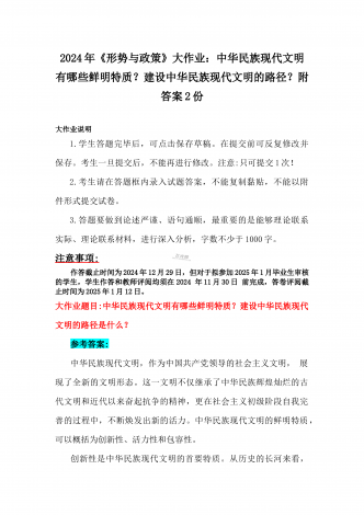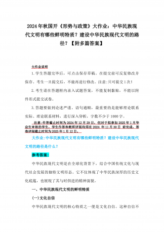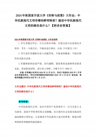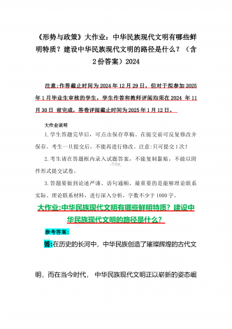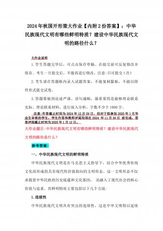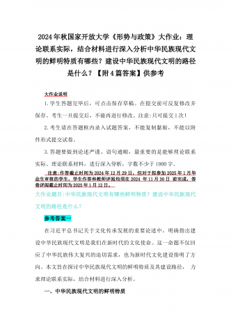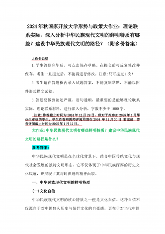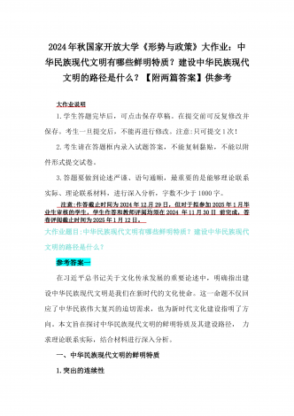 2024年秋国家开放大学《形势与政策》大作业:理论联系实际,结合材料进行深入分析中华民族现代文明的鲜明特质有哪些?建设中华民族现代文明的路径是什么?【附4篇答案】供参考大作业说明1.学生答题完毕后,可点击保存草稿。在提交前可反复修改并保存。考生一旦提交后,不能再进行修改。注意:只可提交1次!2.考生请在答题框内录入试题答案,不能复制黏贴,不能以附件形式提交试卷。3.答题要做到论述严谨、语句通顺,最重要的是能够理论联系实际、理论联系材料,进行深入分析,字数不少于1000字。注意:作答截止时间为20...