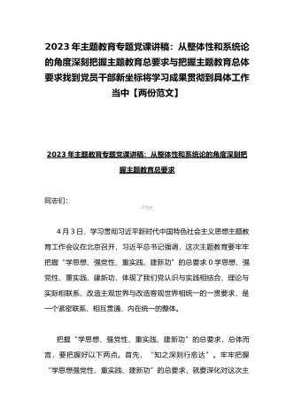 2023年主题教育专题党课讲稿:从整体性和系统论的角度深刻把握主题教育总要求与把握主题教育总体要求找到党员干部新坐标将学习成果贯彻到具体工作当中【两份范文】