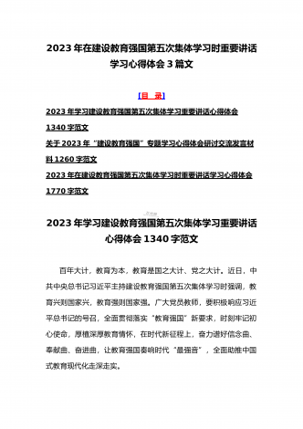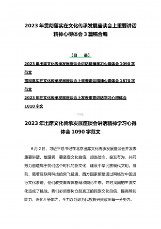2023年学习在文化传承发展座谈会上讲话精神“两个结合”重要论断心得体会稿3篇文【目录】2023年学习在文化传承发展座谈会上讲话精神“两个结合”重要论断心得体会1350字文2023年在文化传承发展座谈会上发表重要讲话学习心得体会1260字范文学习在文化传承发展座谈会上重要讲话深刻理解“三个新高度”重要论断心得1470字范文2023年学习在文化传承发展座谈会上讲话精神“两个结合”重要论断心得体会1350字文“在五千多年中华文明深厚基础上开辟和发展中国特色社会主义,把马克思主义基本原理同中国具体实际...