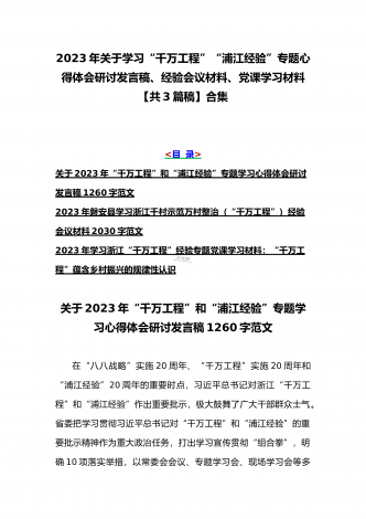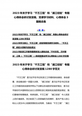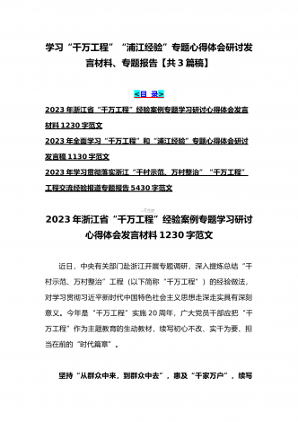 2023年关于学习“千万工程”“浦江经验”专题心得体会研讨发言稿、经验会议材料、党课学习材料【共3篇稿】合集