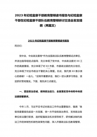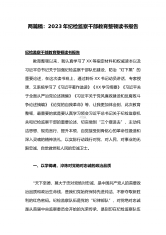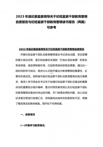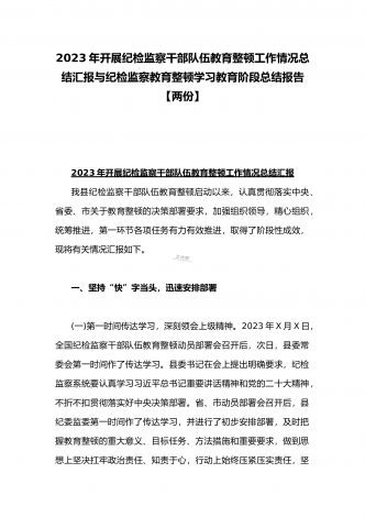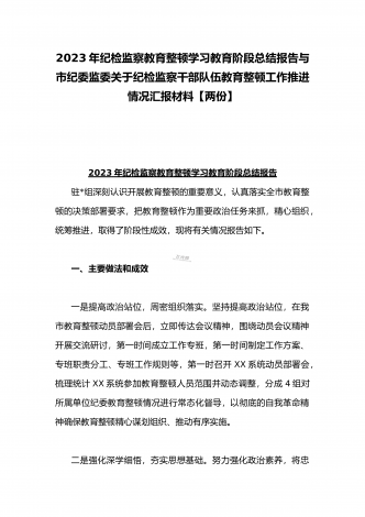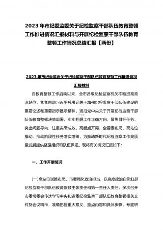 2023年开展纪检监察干部队伍教育整顿工作情况总结汇报与纪检监察干部教育整顿对照信仰缺失、作风不正、清廉失守等“六个方面”个人检视剖析报告【两份】2023年开展纪检监察干部队伍教育整顿工作情况总结汇报队伍教育整顿开展以来,全市法院紧扣“四大任务%“三个环节”,突出深学、严查、实纠、提升“四个关键”,扎实开展“四项教育”,深入查纠整改,全面总结提升,推动教育整顿不断走深走实。一、聚焦教育整顿目标,高标准完成各项任务全市两级法院党组主动扛起主体责任,严格落实“五个亲自”要求,切实加强组织领导,扎实有...
