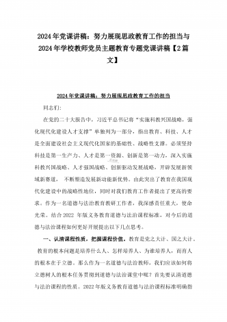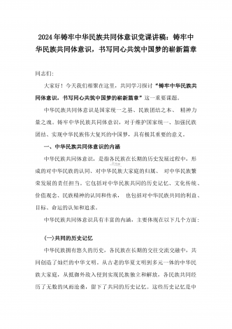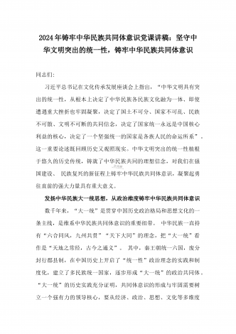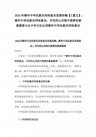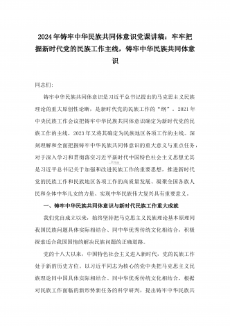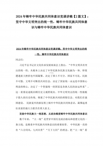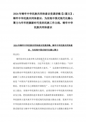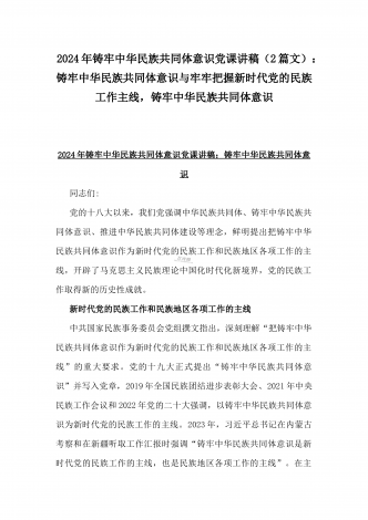 2024年铸牢中华民族共同体意识党课讲稿【2篇文】:铸牢中华民族共同体意识,为实现中国式现代化凝心聚力与牢牢把握新时代党的民族工作主线,铸牢中华民族共同体意识