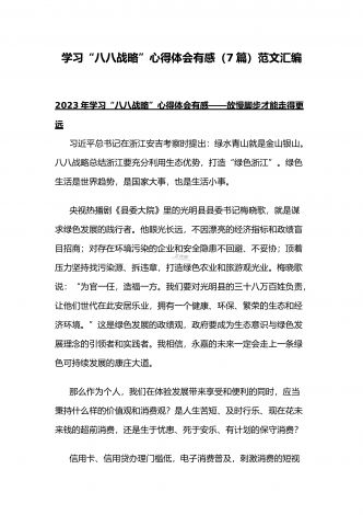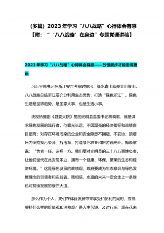 (多篇)2023年学习“八八战略”心得体会有感【附:“‘八八战略’在身边”专题党课讲稿】2023年学习“八八战略”心得体会有感——放慢脚步才能走得更远习近平总书记在浙江安吉考察时提出:绿水青山就是金山银山。八八战略总结浙江要充分利用生态优势,打造“绿色浙江”。绿色生活是世界趋势,是国家大事,也是生活小事。央视热播剧《县委大院》里的光明县县委书记梅晓歌,就是谋求绿色发展的践行者。他眼光长远,不因漂亮的经济指标和政绩盲目招商;对存在环境污染的企业和安全隐患不回避、不妥协;顶着压力坚持找污染源、拆违章...