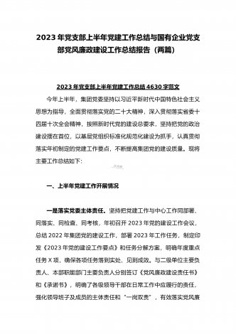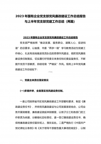 2023年国有企业党支部党风廉政建设工作总结报告与上半年党支部党建工作总结(两篇)