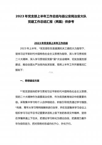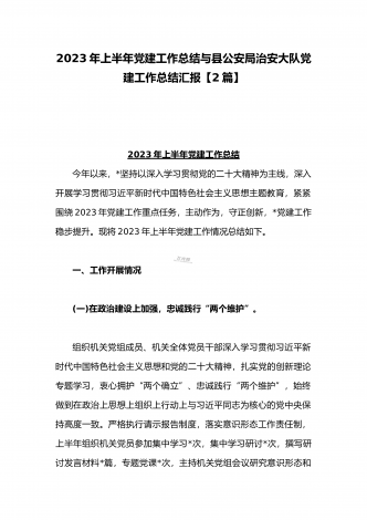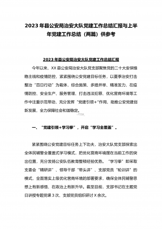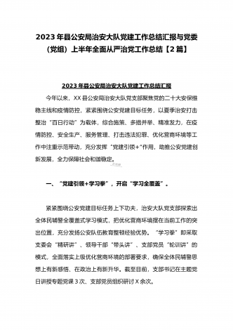 2023年县公安局治安大队党建工作总结汇报与党委(党组)上半年全面从严治党工作总结【2篇】