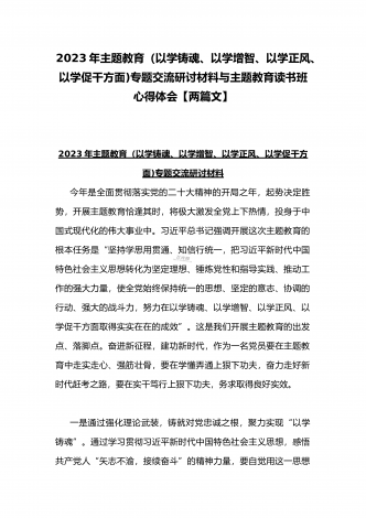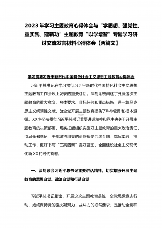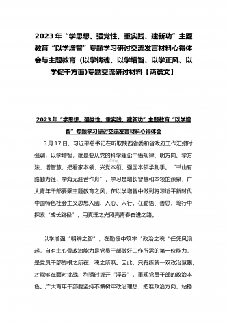 2023年“学思想、强党性、重实践、建新功”主题教育“以学增智”专题学习研讨交流发言材料心得体会与主题教育(以学铸魂、以学增智、以学正风、以学促干方面)专题交流研讨材料【两篇文】