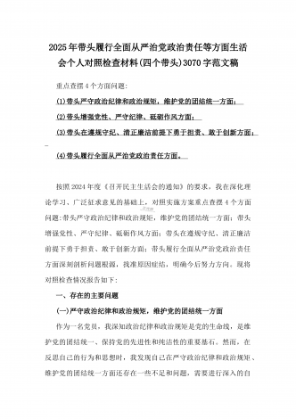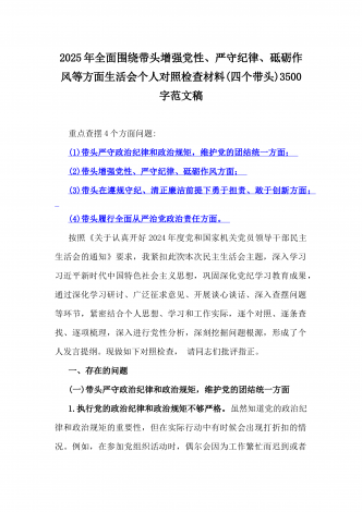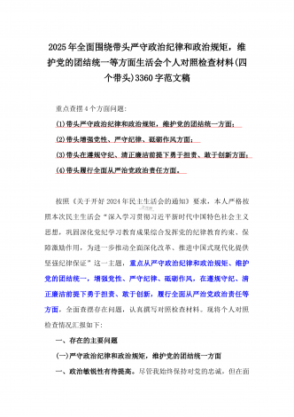 2025年全面围绕带头严守政治纪律和政治规矩,维护党的团结统一等方面生活会个人对照检查材料(四个带头)3360字范文稿