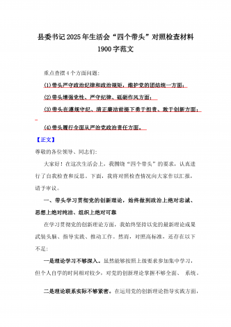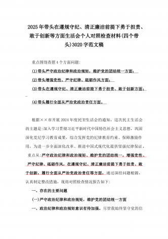 2025年全面围绕带头严守政治纪律和政治规矩,维护党的团结统一等方面生活会个人对照检查材料(四个带头)3360字范文稿重点查摆4个方面问题:(1)带头严守政治纪律和政治规矩,维护党的团结统一方面;(2)带头增强党性、严守纪律、砥砺作风方面;(3)带头在遵规守纪、清正廉洁前提下勇于担责、敢于创新方面;(4)带头履行全面从严治党政治责任方面。按照《关于开好2024年民主生活会的通知》要求,本人严格按照本次民主生活会“深入学习贯彻习近平新时代中国特色社会主义思想,巩固深化党纪学习教育成果综合发挥党的纪...