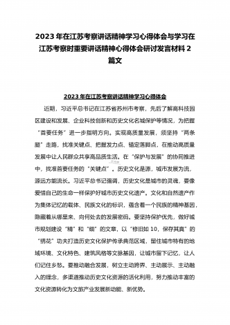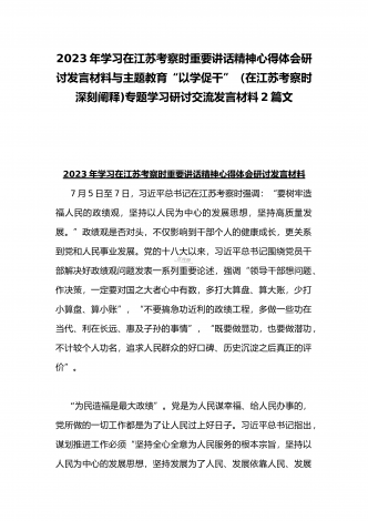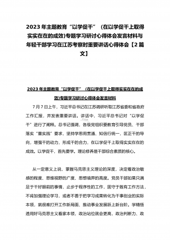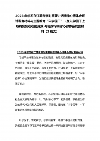 2023年学习在江苏考察时重要讲话精神心得体会研讨发言材料与主题教育“以学促干”(在以学促干上取得实实在在的成效)专题学习研讨心得体会发言材料【2篇文】