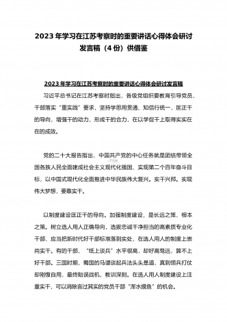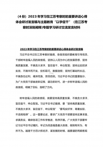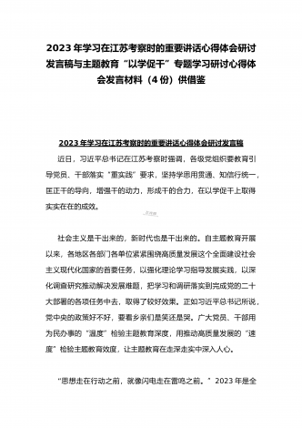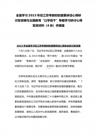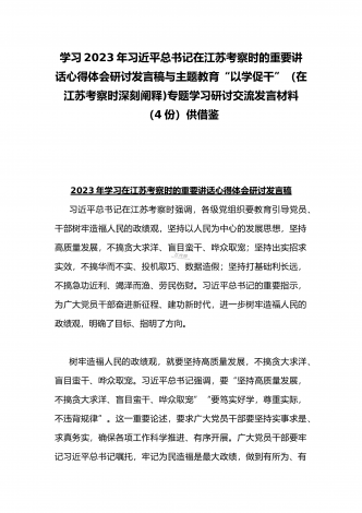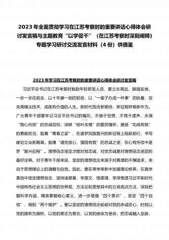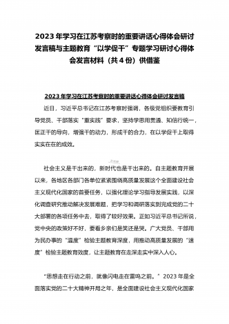 学习2023年习近平总书记在江苏考察时的重要讲话心得体会研讨发言稿与主题教育“以学促干”(在江苏考察时深刻阐释)专题学习研讨交流发言材料(4份)供借鉴