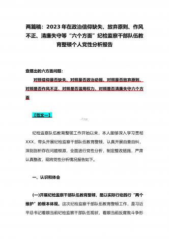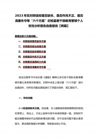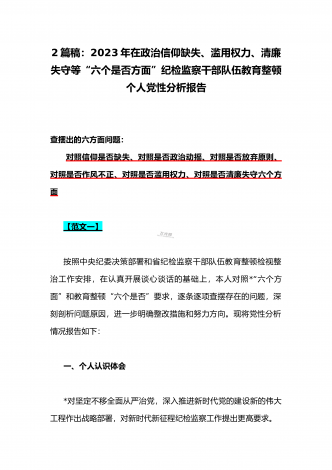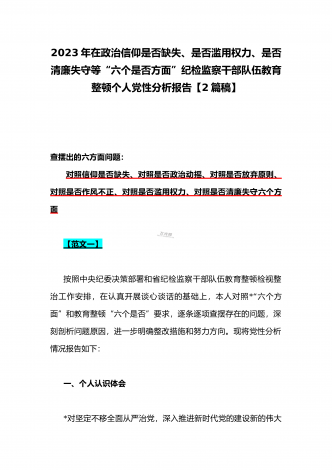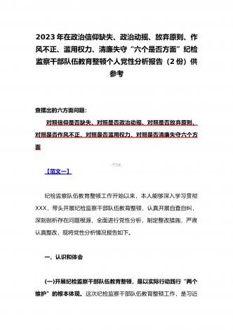 2023年在政治信仰缺失、政治动摇、放弃原则、作风不正、滥用权力、清廉失守“六个是否方面”纪检监察干部队伍教育整顿个人党性分析报告(2份)供参考