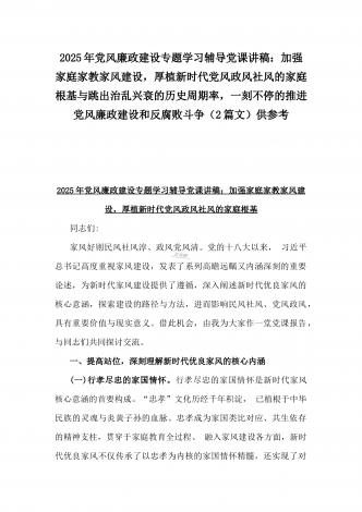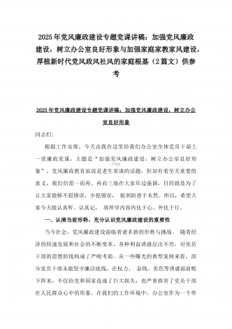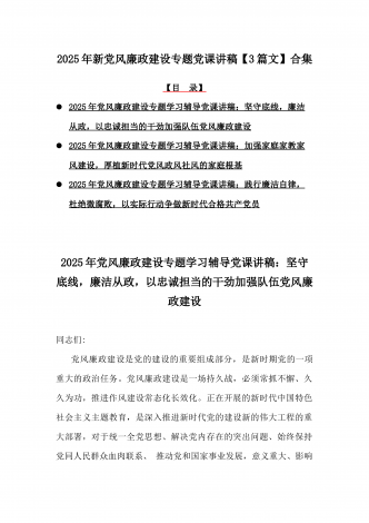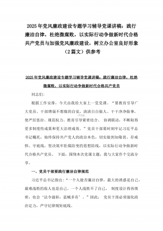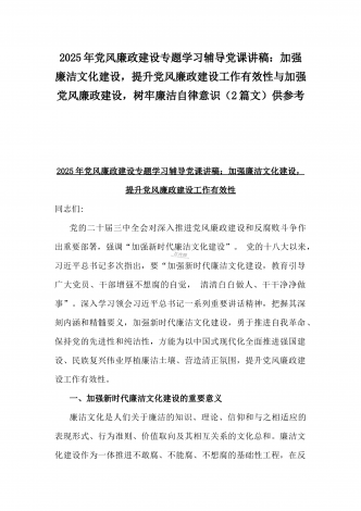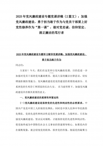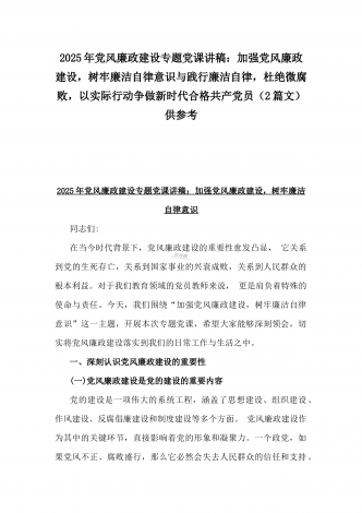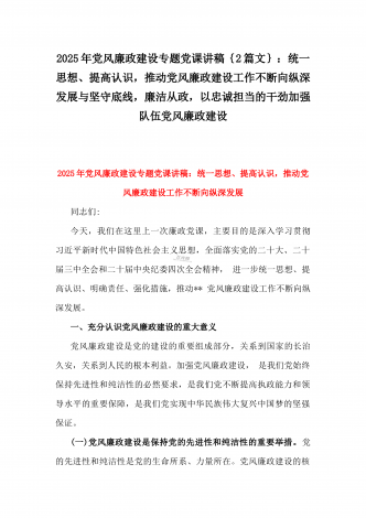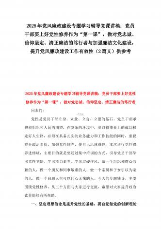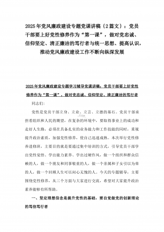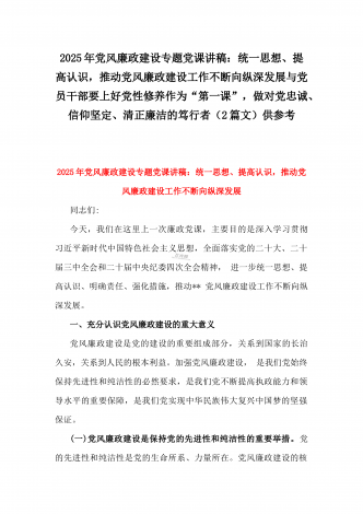 2025年党风廉政建设专题党课讲稿:统一思想、提高认识,推动党风廉政建设工作不断向纵深发展与党员干部要上好党性修养作为“第一课”,做对党忠诚、信仰坚定、清正廉洁的笃行者(2篇文)供参考