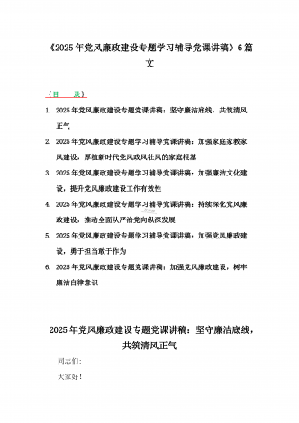 2025年党风廉政建设专题党课讲稿:统一思想、提高认识,推动党风廉政建设工作不断向纵深发展与党员干部要上好党性修养作为“第一课”,做对党忠诚、信仰坚定、清正廉洁的笃行者(2篇文)供参考2025年党风廉政建设专题党课讲稿:统一思想、提高认识,推动党风廉政建设工作不断向纵深发展同志们:今天,我们在这里上一次廉政党课,主要目的是深入学习贯彻习近平新时代中国特色社会主义思想,全面落实党的二十大、二十届三中全会和二十届中央纪委四次全会精神,进一步统一思想、提高认识、明确责任、强化措施,推动**党风廉政建设...