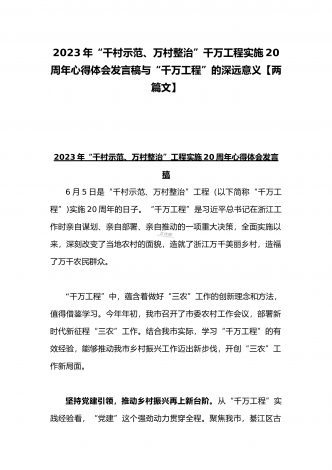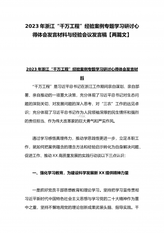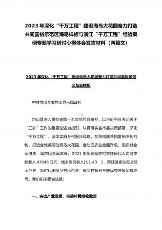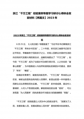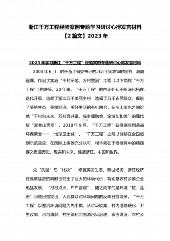 2023年学习浙江“千万工程”经验专题党课学习材料:“千万工程”蕴含乡村振兴的规律性认识与关于学习“千万工程”和“浦江经验”专题心得体会研讨发言稿(2篇文)2023年学习浙江“千万工程”经验专题党课学习材料:“千万工程”蕴含乡村振兴的规律性认识同志们:“千万工程”实施20年来,深刻改变了浙江乡村面貌,为浙江高质量发展建设共同富裕示范区打下坚实基础,探索出一条加强农村人居环境整治、全面推进乡村振兴、建设美丽中国的科学路径。“千万工程”蕴含着习近平新时代中国特色社会主义思想的世界观和方法论,深入学习...