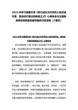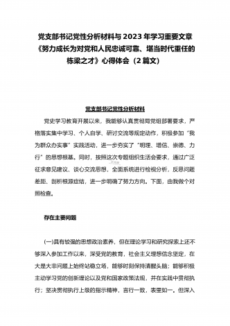 2023年学习《努力成长为对党和人民忠诚可靠、堪当时代重任的栋梁之才》心得与在政治信仰缺失、政治动摇、作风不正、清廉失守六个方面纪检监察干部队伍教育整顿个人党性分析报告(2篇文)学习《努力成长为对党和人民忠诚可靠、堪当时代重任的栋梁之才》心得体会近日出版的第13期《求是》杂志发表了中共中央总书记、国家主席、中央军委主席习近平的重要文章《努力成长为对党和人民忠诚可靠、堪当时代重任的栋梁之才》,文章强调,年轻干部是党和国家事业发展的希望,党和人民对你们寄予厚望。大家一定要锤炼对党忠诚的政治品格,树立...