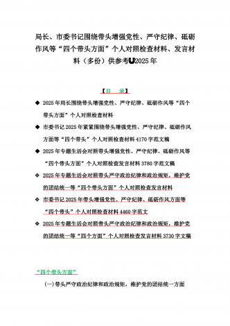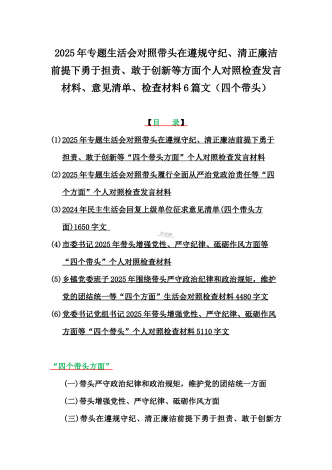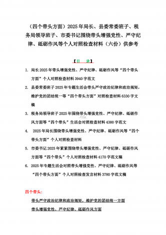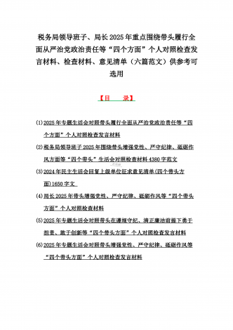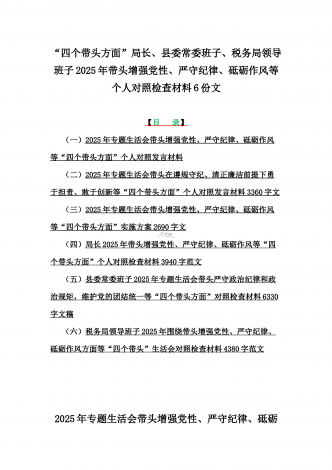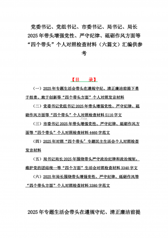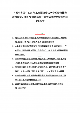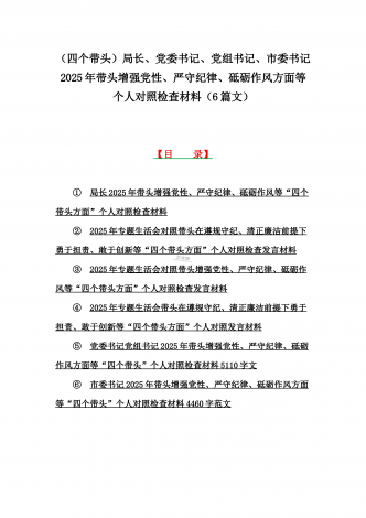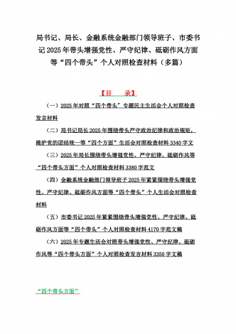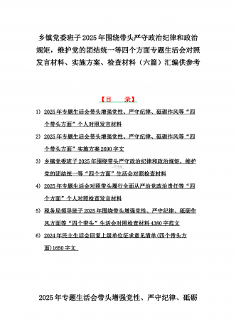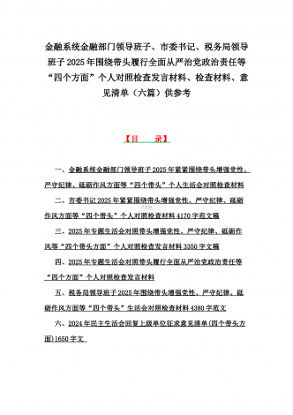 金融系统金融部门领导班子、市委书记、乡镇党委班子2025年围绕带头严守政治纪律和政治规矩,维护党的团结统一等“四个方面”专题生活会对照发言材料、实施方案、检查材料(6篇文)【目录】一、金融系统金融部门领导班子2025年紧紧围绕带头增强党性、严守纪律、砥砺作风方面等“四个带头”个人生活会对照检查材料二、市委书记2025年紧紧围绕带头增强党性、严守纪律、砥砺作风方面等“四个带头”个人对照检查材料4170字范文稿三、2025年专题生活会对照带头增强党性、严守纪律、砥砺作风等“四个带头方面”个人对照检查...