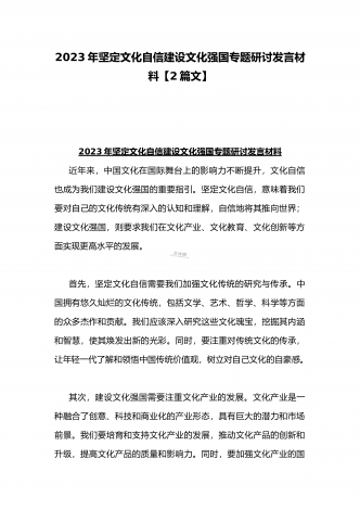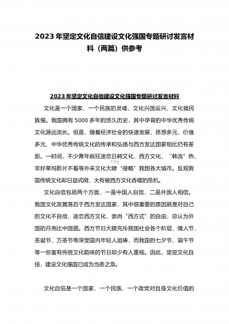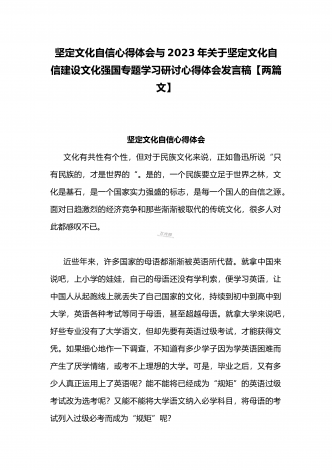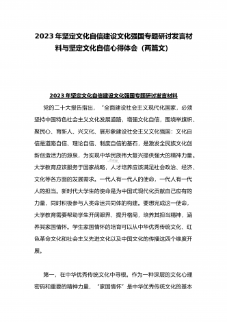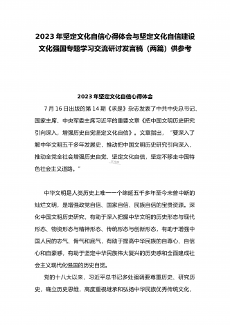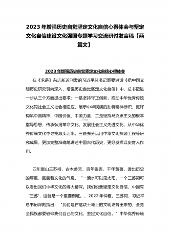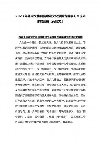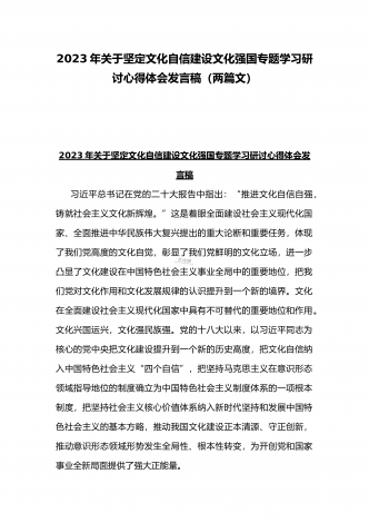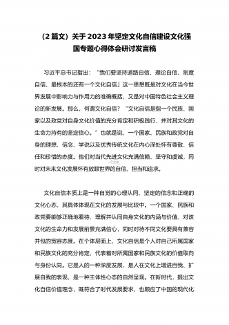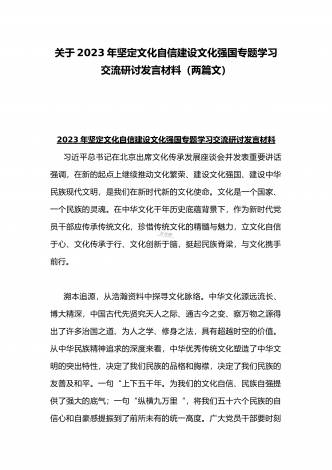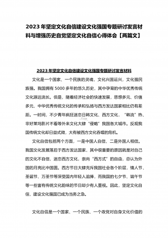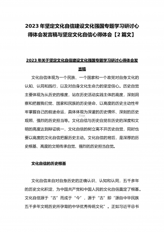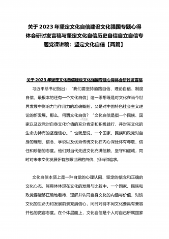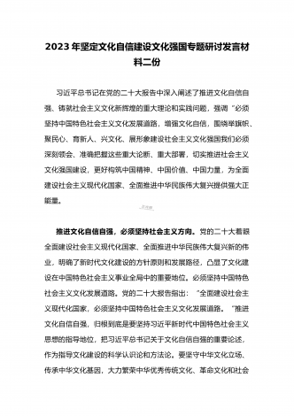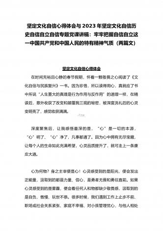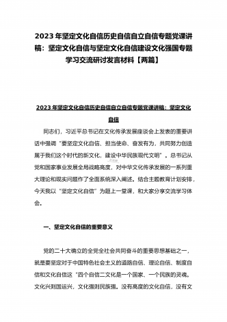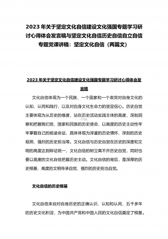2023年坚定文化自信历史自信自立自信专题党课讲稿:牢牢把握自信自立这一中国共产党和中国人民的特有精神气质与坚定文化自信建设文化强国专题学习交流研讨发言材料(两篇文)
