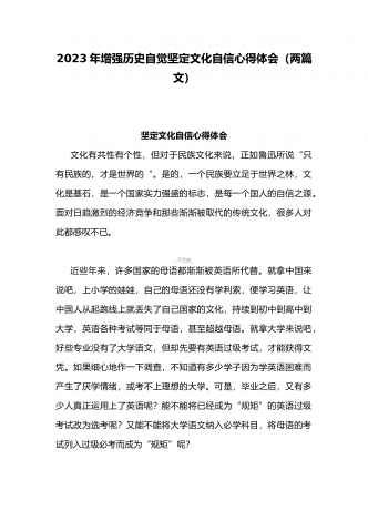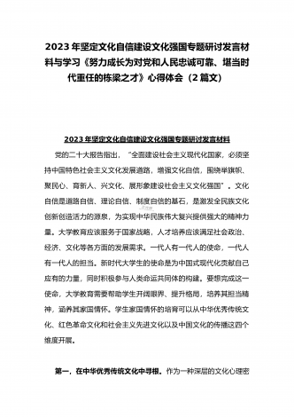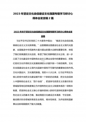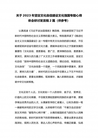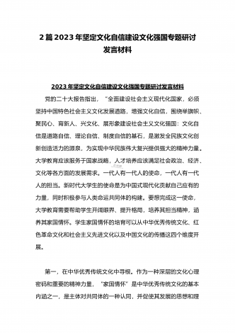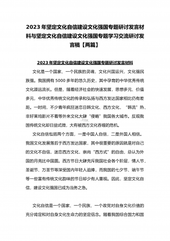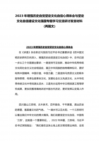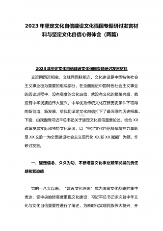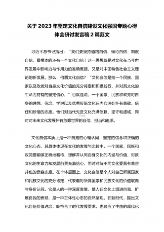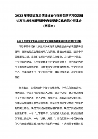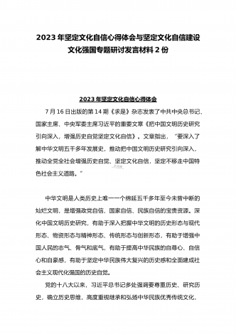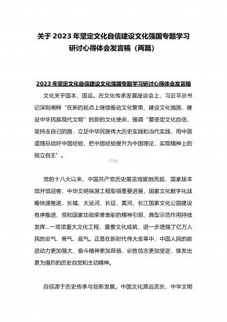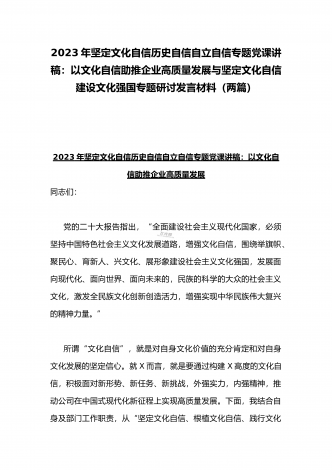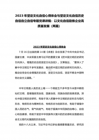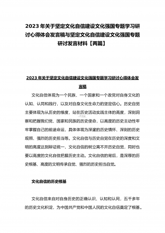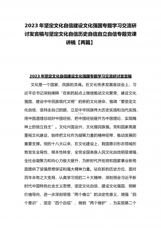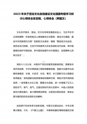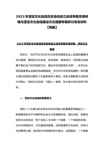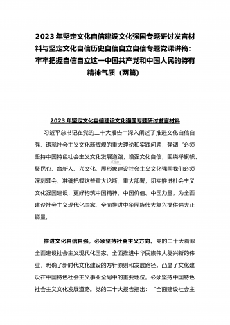 2023年坚定文化自信历史自信自立自信专题党课讲稿:牢牢把握自信自立这一中国共产党和中国人民的特有精神气质与坚定文化自信建设文化强国专题心得体会研讨发言稿(两篇文)