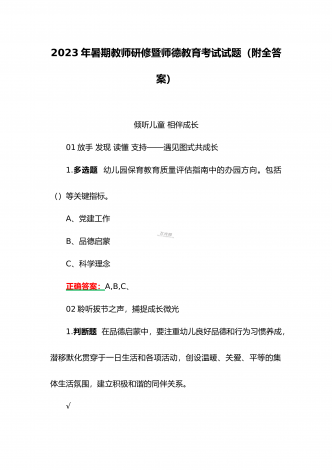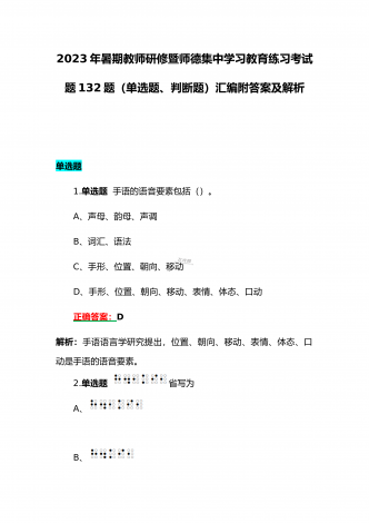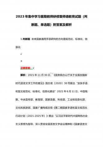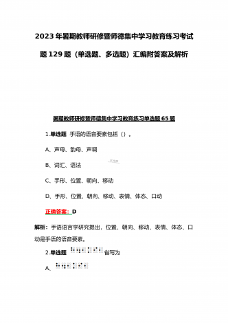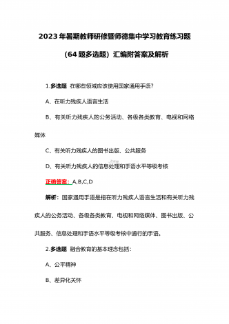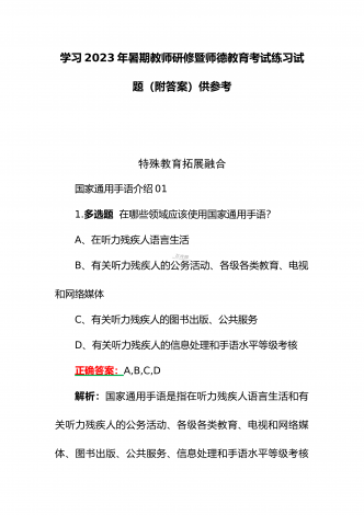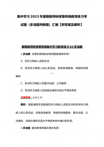 集中学习2023年暑期教师研修暨师德教育练习考试题(多选题判断题)汇编【附答案及解析】暑期教师研修暨师德集中学习教育练习64多选题1.多选题在哪些领域应该使用国家通用手语?A、在听力残疾人语言生活B、有关听力残疾人的公务活动、各级各类教育、电视和网络媒体C、有关听力残疾人的图书出版、公共服务D、有关听力残疾人的信息处理和手语水平等级考核正确答案:A,B,C,D解析:国家通用手语是指在听力残疾人语言生活和有关听力残疾人的公务活动、各级各类教育、电视和网络媒体、图书出版、公共服务、信息处理和手语水平...