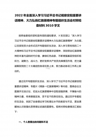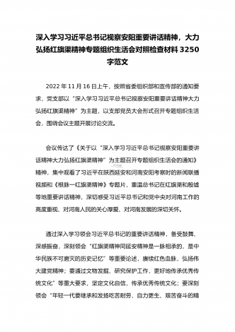 2022年全面深入学习习近平总书记视察安阳重要讲话精神,大力弘扬红旗渠精神专题组织生活会对照检查材料3010字文