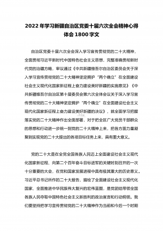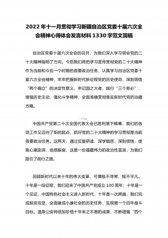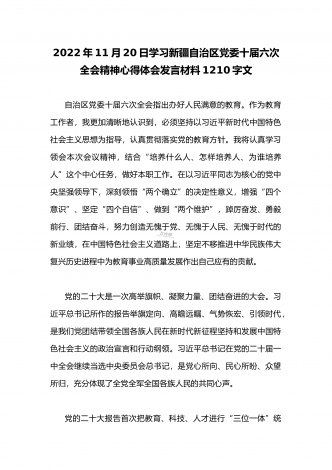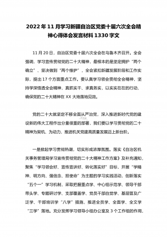 2022年十一月贯彻学习新疆自治区党委十届六次全会精神心得体会发言材料1330字范文简稿