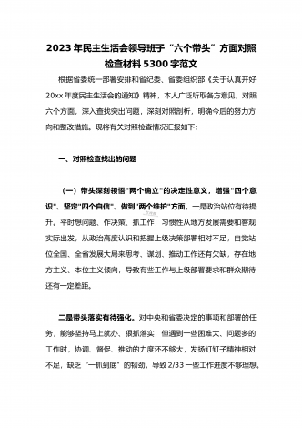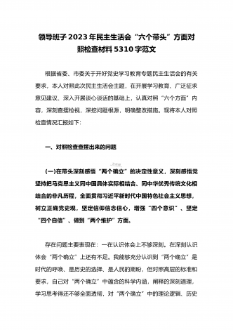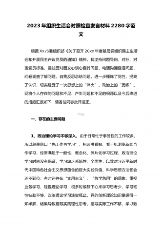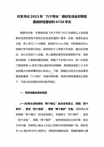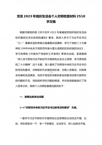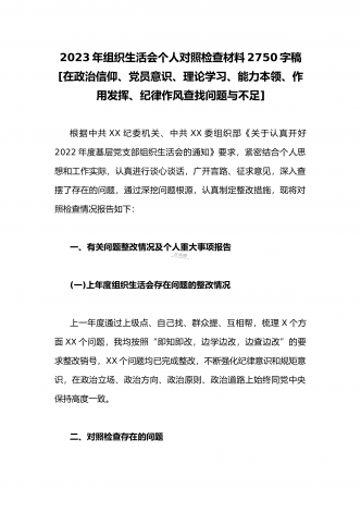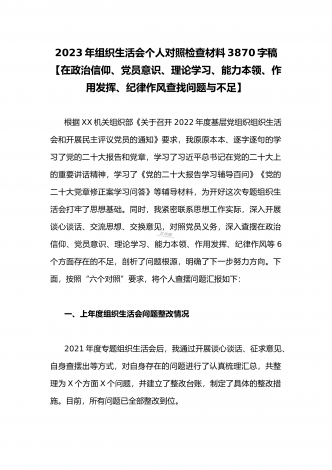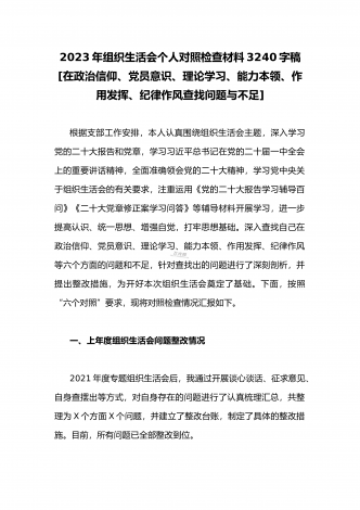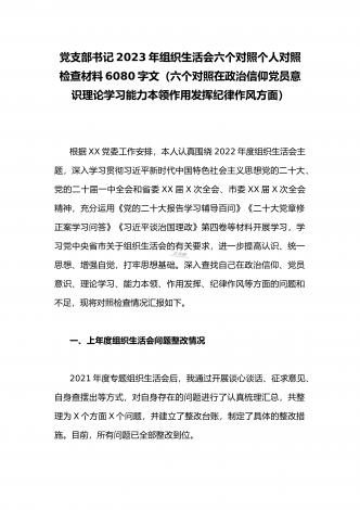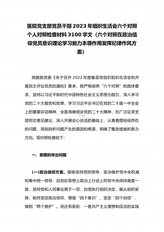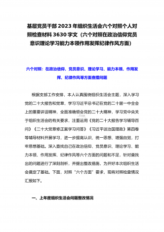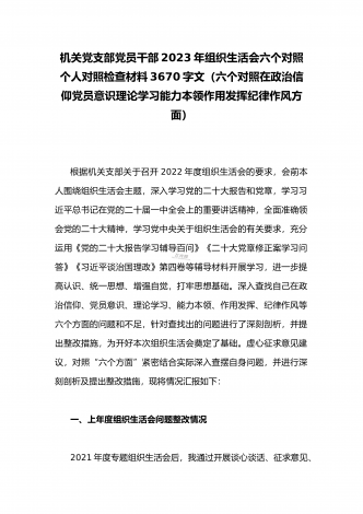 机关党支部党员干部2023年组织生活会六个对照个人对照检查材料3670字文(六个对照在政治信仰党员意识理论学习能力本领作用发挥纪律作风方面)