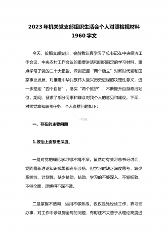 机关党支部党员干部2023年组织生活会六个对照个人对照检查材料3670字文(六个对照在政治信仰党员意识理论学习能力本领作用发挥纪律作风方面)根据机关支部关于召开2022年度组织生活会的要求,会前本人围绕组织生活会主题,深入学习党的二十大报告和党章,学习习近平总书记在党的二十届一中全会上的重要讲话精神,全面准确领会党的二十大精神,学习党中央关于组织生活会的有关要求,充分运用《党的二十大报告学习辅导百问》《二十大党章修正案学习问答》《习近平谈治国理政》第四卷等辅导材料开展学习,进一步提高认识、统一思...