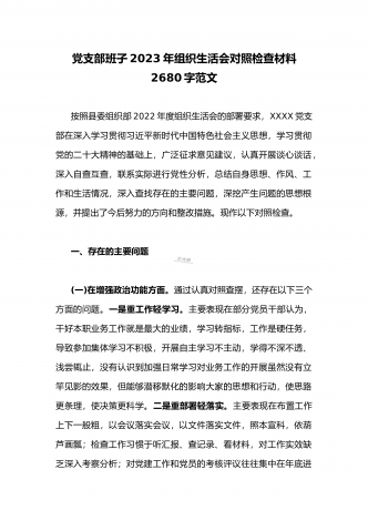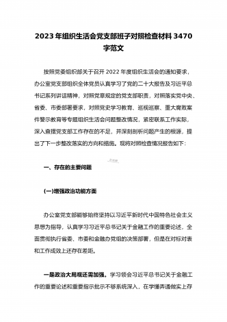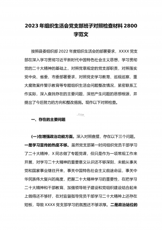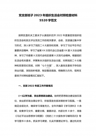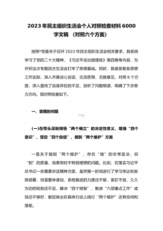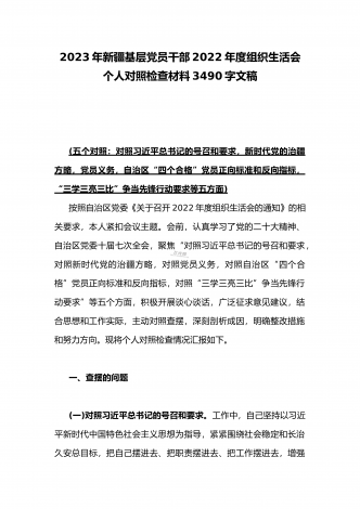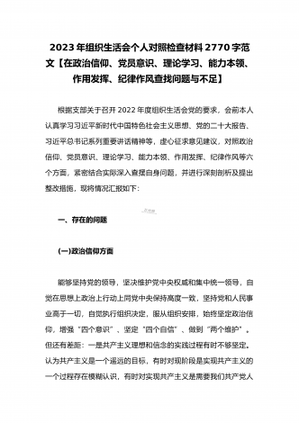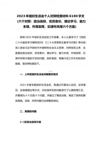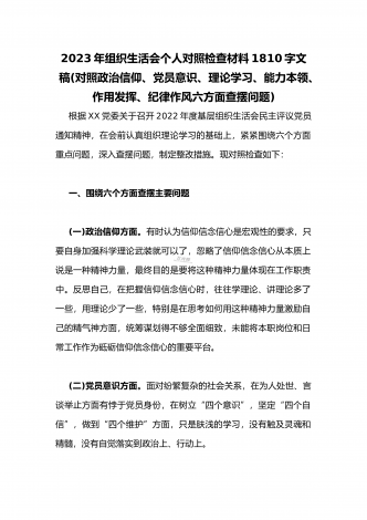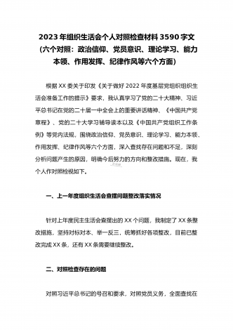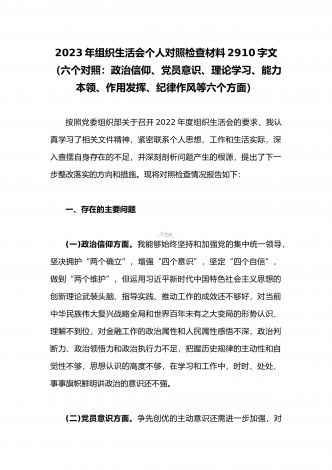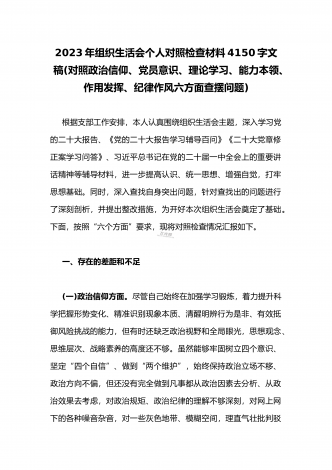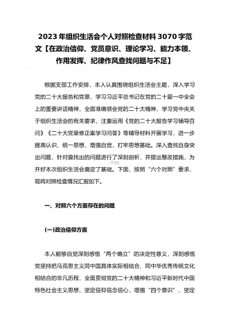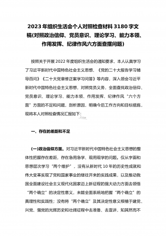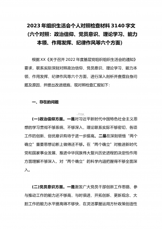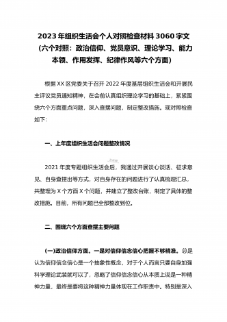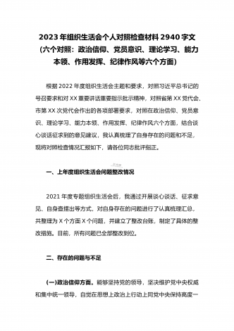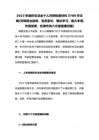 2023年组织生活会个人对照检查材料3780字文稿(对照政治信仰、党员意识、理论学习、能力本领、作用发挥、纪律作风六方面查摆问题)根据支部工作安排,本人认真围绕2022年度组织生活会主题,深入学习党的二十大报告和二十大新党章,学习习近平总书记在党的二十届一中全会上的重要讲话精神,全面准确领会党的二十大精神,学习党中央关于组织生活会的有关要求,按照组织生活会通知要求,把自己摆进去、把职责摆进去、把工作摆进去,深入检视查摆问题,并制定整改措施。下面,按照本次组织生活会要求,现将对照检查情况汇报如下。...