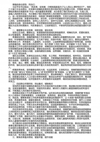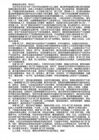 尊敬的各位领导,同志们: 习近平总书记在今年9月召开的全国教育大会上强调,建设教育强国要正确处理支撑国家战略和满足民生需求、培养人才和满足社会需要等重大关系。职业教育领域,要构建职普融通、产教融合的职业教育体系,大力培养大国工匠、能工巧匠、高技能人才。这为职业教育在“建设教育强国的新征程中担当作为提供了根本遵循。党的二十届三中全会强调要因地制宜发”展新质生产力,这是推动高质量发展的内在要求和重要着力点。人才是加速新质生产力形成的重要智力资源。新质生产力发展不仅需要战略科学家、一流科技领军人...