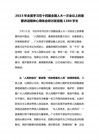 2023年认真学习在参加十四届全国人大一次会议江苏代表团审议时重要讲话心得体会1160字范文稿近日,2023两会首到江苏团。在江苏代表团,习近平总书记嘱托各级党委和政府必须将民生“牢牢记在心上、时时抓在手上,确保取得扎扎实实的成效”。悠悠万事,民生为大。为民,要把人民群众的所盼所愿放在心上,以全情投入、全力奉献奋斗在人民群众需要的地方。新时代新征程上,广大党员干部要秉持为民初心,从“一”开始,由“心”而发,于“干”着力,踏稳“最美”足迹,擦亮“初心”底色,实现人民群众“向往的生活”,托举他们“稳...