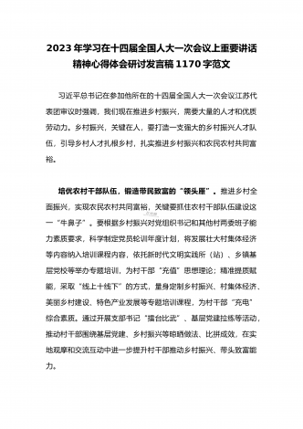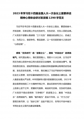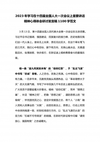 2023年全面学习在十四届全国人大一次会议上重要讲话精神心得体会研讨发言稿1380字范文