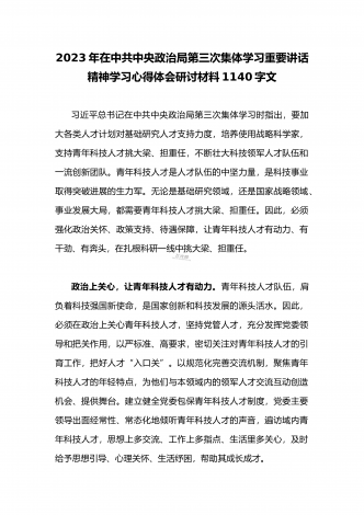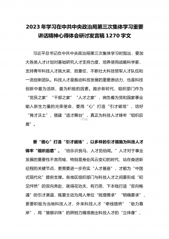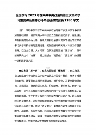 2023年党员领导在中共中央政治局第三次集体学习重要讲话精神学习心得体会研讨材料1370字文