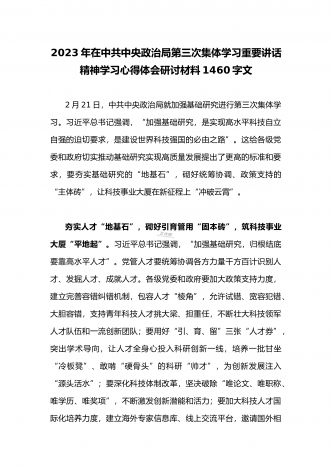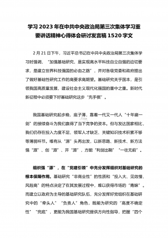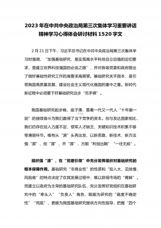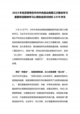 2023年党员领导在中共中央政治局第三次集体学习重要讲话精神学习心得体会研讨材料1370字文2月21日下午,中共中央政治局就加强基础研究进行第三次集体学习。习近平总书记在主持学习时强调,加强基础研究,是实现高水平科技自立自强的迫切要求,是建设世界科技强国的必由之路。各级党委和政府要把加强基础研究纳入科技工作重要日程,加强统筹协调,加大政策支持,推动基础研究实现高质量发展。各地各部门要知责于心、俯身千事,把岗位责任落实到具体行动中,坚持“点上用力”,完善政策机制、加强人才培养、赓续优良传统,用心用...