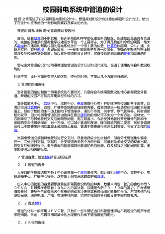 校园弱电系统中管道的设计摘 要 文章阐述了在校园网弱电系统设计中,管道规划和设计应注意的问题和设计方法,给出 了在设计中应考虑的一些影响因素以及解决的方法。 关键词 管孔 段长 高程 管道基础 校园网 目前,随着教育的不断发展,有许多高校和中学都在建设新的校区。新建校园是否具有先进的、完整的弱电系统是衡量学校建设水平的一个主要标志。为了满足目前和今后的需要,绝大多数学校在建设时都将校园的弱电系统放在一个很主要的位置。计算机校园网、公共广播、安防与监控、有线电视“”、多媒体教学、一卡...
