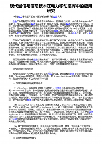 现代通信与信息技术在电力移动指挥中的应用研究 1现行电力移动指挥系统中通信与信息技术的应用状况 电力工业是利用发电设施、配电系统将各种一次能源转化为电能,并向用户传输的一种工业部门。电力工业是国民经济和工业各部门的基本动力,是国民经济发展的先行军和支柱。所以,建立健全电力应急系统是有很大的必要性和紧迫性。为了保障电力安全应急系统的顺利有序运行,国家先后颁布了《国家处置电网大面积停电事件应急预案》和25个专项预案,从制度法规上加强了安全机制的完善,有助于电力应急管理工作的有效开展。只有建立一套...