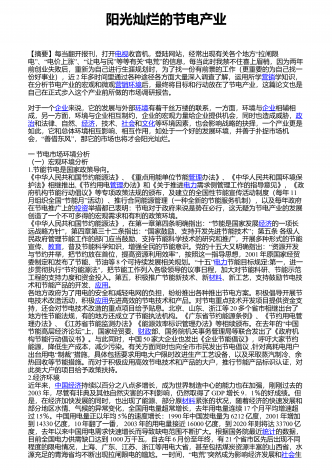 阳光灿烂的节电产业 【摘要】每当翻开报刊,打开电视“收音机,登陆网站,经常出现有关各个地方拉闸限”“”“”“”电、电价上涨、让电与民等等有关电荒的信息,每当此时我禁不住喜上眉梢,因为两年前创业失败后,重新为自己进行生涯规划时,为了找一份有前景的工作(更重要的为自己找一份好事业),近2年多时间里通过各种途径各方面大量深入调查了解,运用所学营销学知识,在分析节电产业的宏观和微观营销 环境 后,最终将目标和行动放在了节电产业,这篇论文也是自己在正式步入这个产业前所做的市场调研报告。对于一个企业来...