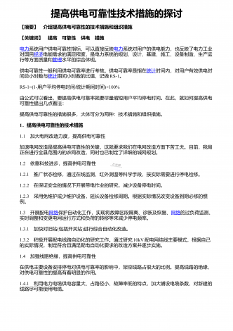 提高供电可靠性技术措施的探讨 【摘要】介绍提高供电可靠性的技术措施和组织措施 【关键词】提高可靠性供电措施电力系统用户供电可靠性指标,可以直接反映电力系统对用户的供电能力,也反映了电力工业对国民经济电能需求的满足程度,是电力系统的规划、设计、基建、施工、设备制造、生产运行等方面质量和管理水平的综合体现。供电可靠性一般利用供电可靠率进行考核。供电可靠率是指在统计时间内,对用户有效供电时间总小时数与统计期间小时数的比值,记做RS-1。RS-1=(1-用户平均停电时间/统计期间时间)×100%由...