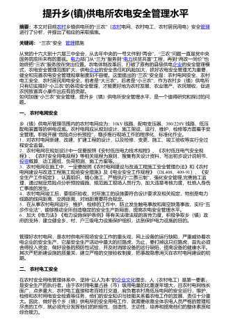 提升乡(镇)供电所农电安全管理水平摘要:本文对目前农村“”乡镇供电所的三农(农村电网、农村电工、农村居民用电)安全管理进行了分析,并提出了相应的采取措施。 关键词:“”三农安全 管理措施 “”“”从党的十六大到十六届三中全会,从去年中央的一号文件到两会,三农问题一直是党中央国务院前所未有的重视。电力“”“部门从三为服务到电力”“”扶贫共富工程,再到两改一同价也“”始终把三农服务放在突出位置。农电体制改革后,打破了原有的县级供电企业的安全管理模式,农电安全管理范围扩大,供电企业的安...