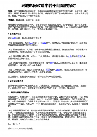 县城电网改造中若干问题的探讨摘要:该文根据县城电网的特点,引出城网配电线路改造中存在的线径选取,负荷划块、电杆选型、环网化和绝缘化等一系列技术问题,根据自己实际工作中的具体做法,结合城网规划导则,提出了一套切实可行的解决办法。关键词:县城电网;电网改造;环网随着县城电网改造的逐步深入,由于县城电网本身固有的特点,在电网规划、设计与施工中,遇到了许多农网改造中不曾出现过的问题,针对奉化市供电局在10kV县城配电网改造中碰到的一些问题,以及相应设计经验,现提出与读者探讨交流。1县城电网特点相对农村电...
