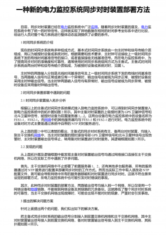 一种新的电力监控系统同步对时装置部署方法 目前,同步对时装置已经在电力监控系统中广泛应用。随着同步对时装置的普及,电力监控系统中有了统一的时钟信号。这样就实现了异地数据在相同的时间参考坐标系中进行比较,给运行人员对整个电力系统进行整体动态监测提供了必要的条件。 1 时间同步系统的介绍 现在的时间同步系统有多种组成方式,基本式时间同步系统由一台主时钟和信号传输介质组成,用以为被授时设备或系统对时。根据需要和技术要求,主时钟可设接收上一级时间同步系统下发的有线时间基准信号的接口,或者直接接收无...