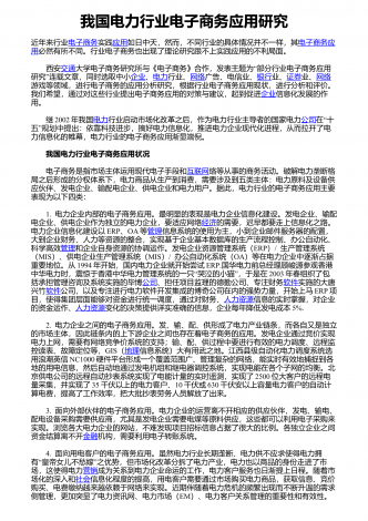 我国电力行业电子商务应用研究近年来行业电子商务实践应用如日中天,然而,不同行业的具体情况并不一样,其电子商务应用必然有所不同。行业电子商务也出现了理论研究跟不上实践应用的不利局面。西安交通“大学电子商务研究所与《电子商务》合作,发表主题为部分行业电子商务应用”研究连载文章,同时选取中小企业、电力行业、网络广告、电信业、银行业、证券业、网络游戏等领域,进行电子商务的应用分析研究,根据行业电子商务应用现状,进行分析和评价。我们希望,通过对这些行业提出电子商务应用的对策与建议,起到促进企业信息化发展的...