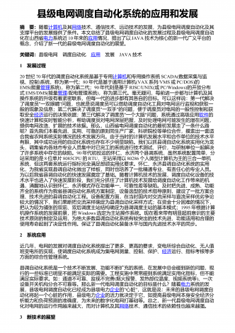 县级电网调度自动化系统的应用和发展 摘要:随着计算机及其网络技术、通信技术、远动技术的发展,为县级电网调度自动化及其支撑平台的发展提供了条件。本文总结了县级电网调度自动化的发展过程及县级电网调度自动化在山西省电力系统近10年来的应用情况,提出了以JAVA技术为核心的新一代广义平台的概念,介绍了新一代的县级电网调度自动化的展望。关键词:县级电网调度自动化应用发展JAVA技术1 发展过程20世纪70年代的调度自动化系统是基于专用计算机和专用操作系统SCADA(数据采集与监视、控制)系统,称为第一代;...